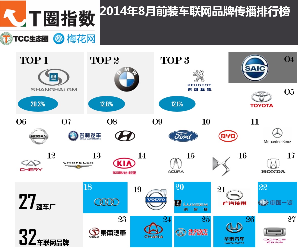从百度指数最近一年的统计来看,相比“车联网”,“互联网汽车”一度是个无人问津的冷僻关键词,在上汽阿里率先举旗之前一直静悄悄。作为中国最大T车企,上汽集团一直在车联网领域占据绝对领先优势,前装车联网用户数和前装车联网终端出货量长期占据全国的60%以上。从最近T圈指数的中国汽车前装车联网品牌传播排行榜也可以看出上汽集团旗下的车联网品牌在B2C传播影响优势相当明显。